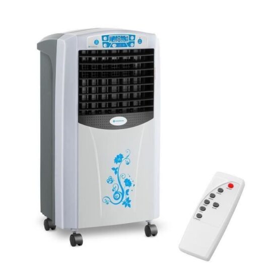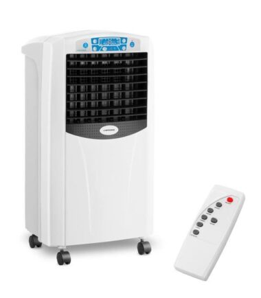 Refroidisseur d’air avec fonction chauffante – 5-en-1 – Réservoir d’eau de 6 litres Numéro d’article EX10250252 Modèle: UNI_COOLER_03 Informations sur le produit: Refroidissement : 65 W Réservoir : 6 l Télécommande Niveau sonore : ≤60 dB Temp. sort