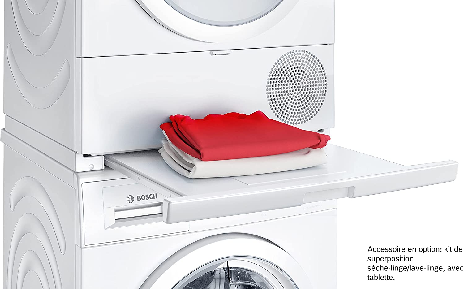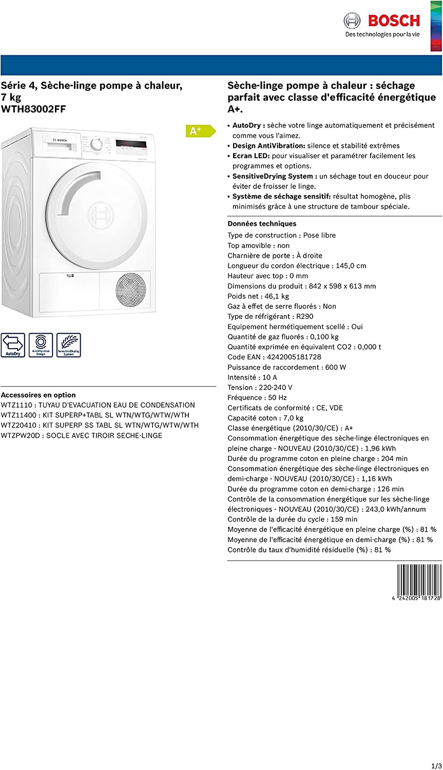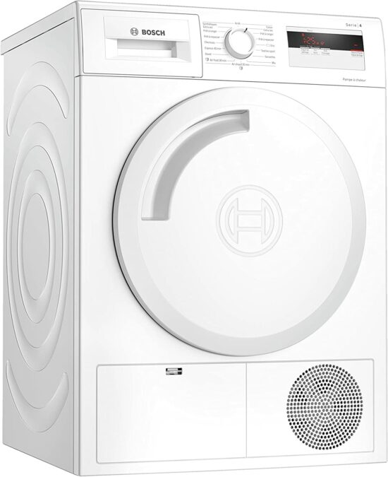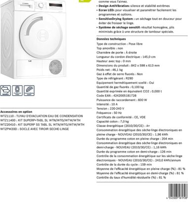 Bosch Sèche-linge pompe à chaleur Série 4 – AutoDry – Pose libre – 7 kg – 112l – Blanc Sèche-linge pompe à chaleur : séchage parfait avec classe d’efficacité énergétique. ● Technologie AutoDry : la garantie d’un séchage parfait et respectueux des textiles, grâce à la précision des sondes ● Design AntiVibration: silence et stabilité extrêmes ● Ecran LED: pour visualiser et paramétrer facilement les programmes et options. ● SensitiveDrying System : un séchage tout en douceur grâce à la structure unique du tambour● Système de séchage sensitif: résultat homogène, plis minimisés grâce à une structure de tambour spéciale. -Sèche-linge condensation avec pompe à chaleur -Classe d’efficacité énergétique A+ sur une échelle allant de A+++ à D. -Capacité cycle Coton: 7 kg -Tambour galvanisé 112l, structure coussin d’air -Consommation électrique annuelle: 243 kWh -Consommation électrique cycle Coton charge pleine 1.96 kWh / demi-charge 1.16 kWh -Durée moyenne du cycle Coton charge pleine 204 min / demi-charge : 159 min -Efficacité de condensation B -Programmes : Coton, Synthétiques, Mix, Serviettes, Minuterie froid 30 min, Minuterie chaud 30 min, Textiles sport, Duvet, Express 40 min, Chemises -Options (touches): Anti froissage, Degré de séchage, Fin différée 24 h -Cycle anti-froissage 120 min -Filtre EasyClean devant le condenseur, facile à nettoyer -Technologie AutoDry: séchage parfait -Ecran LED pour temps restant et fin différée 24 h, déroulement du programme, fonctions spéciales -Signal sonore fin de programme -Sécurité enfants -Dimensions: H 84.2 x L 59.8 x P 59.9 cm Bosch
