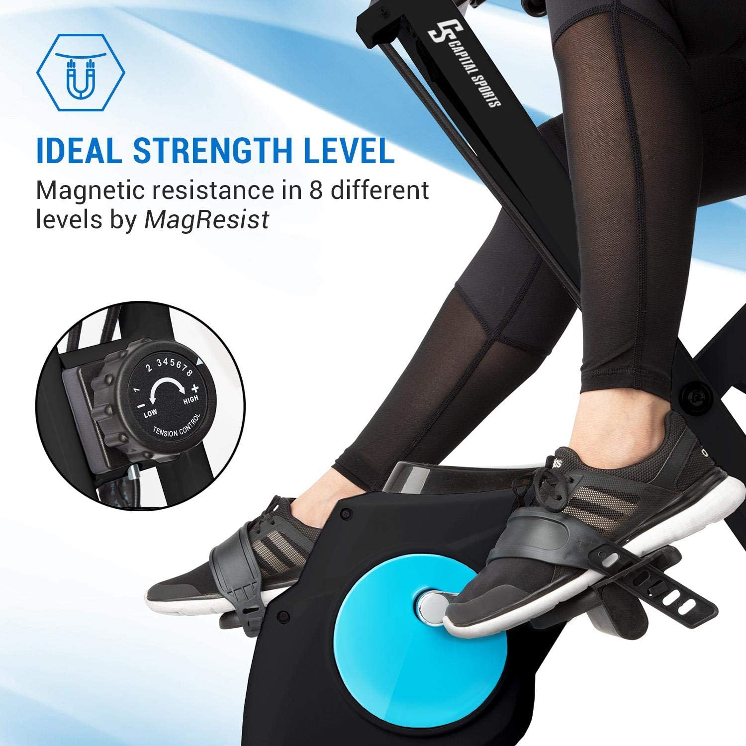 Capital Sports Azura M3 Pro Vélo d’Appartement Pliable, Vélo d’Exercice Cardio-training, Cross Trainer pour la Maison, Home Trainer, Pédalier d’Appartement, Vélo d’Intérieur Magnétique, Support Tablette, Blanc/Bleu. Nous avons fondé Capital Sports à Berlin en 2014 en tant que passionnés de fitness urbain. En commençant par équiper des athlètes de CrossFit et en les guidant sur le chemin de la compétition, nous avons orienté nos équipements vers un entraînement à domicile efficace et varié. Aujourd’hui, nous sommes représentés dans le monde entier comme une marque de fitness établie et utilisant les dernières technologies. Performez avec des pédales antidérapantes. Les pédales antidérapantes avec sangles réglables de ce vélo d’appartement pliable offrent une largeur et un confort agréable pendant votre entraînement et garantissant votre sécurité de vos pieds. La fixation de vos pieds permet d’améliorer le positionnement du corps et la prise en main pour des montées en puissance intenses. Améliorer votre votre niveau cardio. Doté de 8 niveaux de résistance réglables vous permettant d’adapter l’entraînement selon vos besoins, le vélo d’appartement Capital Sports convient à tous les âges et à toutes les conditions physiques. En plus, ce vélo d’intérieur comprend un entraîneur d’abdominaux. Préparez-vous à repousser vos limites et à découvrir votre véritable potentiel physique. Caractéristiques du produit : Système d’entraînement par courroie silencieux pour une utilisation en salle de sport ou à domicile. Entraînement cardio et abdominaux 3 en 1 8 niveaux de résistance pour un entraînement varié Siège et guidon réglables pour plus de confort Design pliable et peu encombrant Contenu de la livraison : Vélo d’exercice Manuel multilingue Dimensions : Dimensions (installé) : 100 x 60x 113 cm (LxHxP) Dimensions (plié) : 60 x 134 x 54 cm (LxHxP) Poids : 18,4 kg