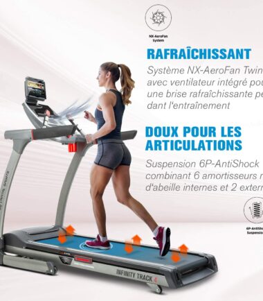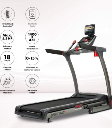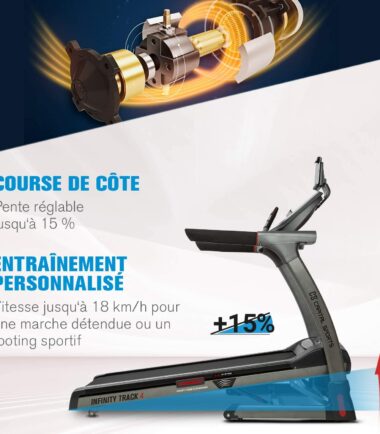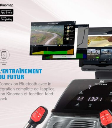 - Tapis roulant de sport électrique avec fonctionnalités d’interconnexion telles que l’intégration complète de l’application Kinomap avec feedback Bluetooth.
