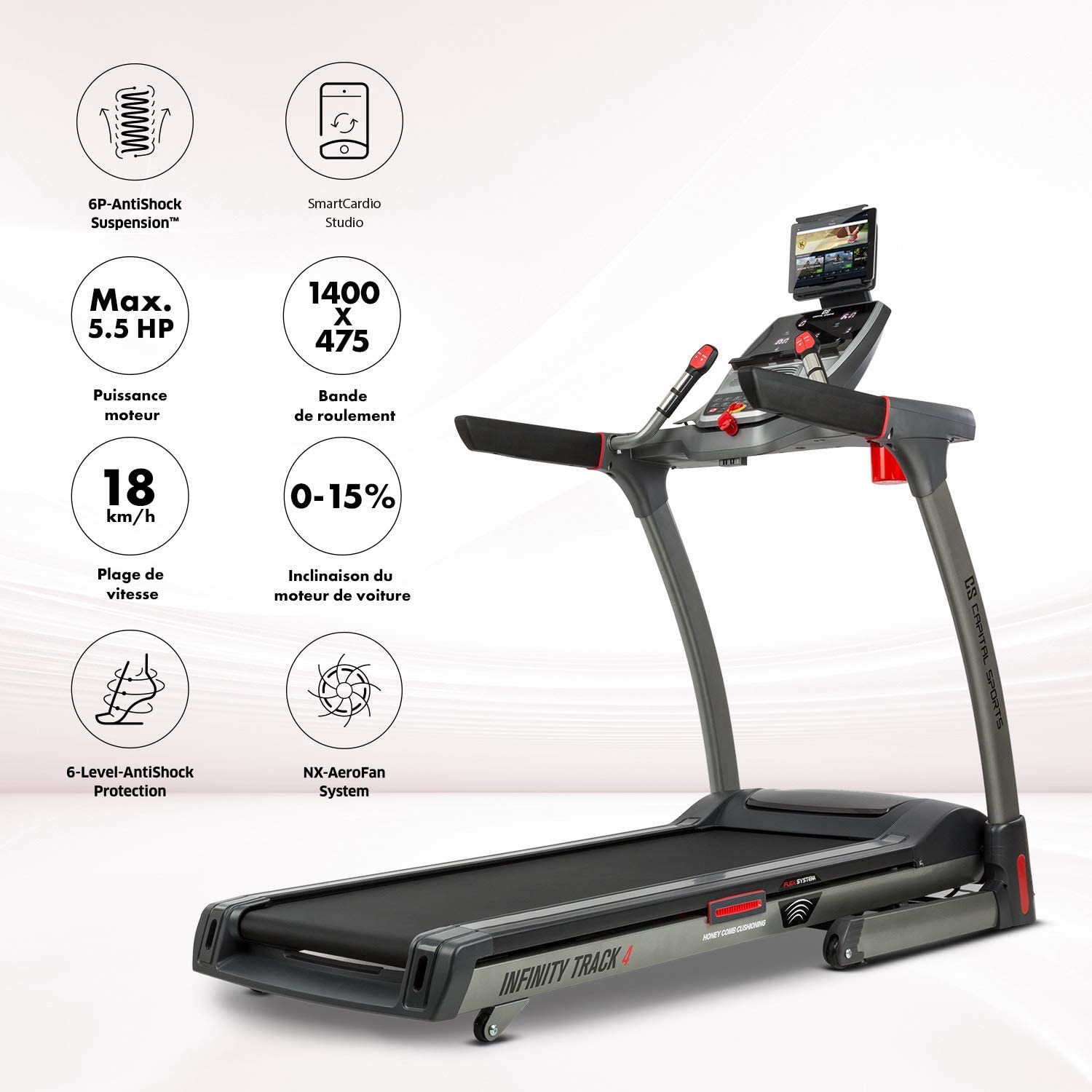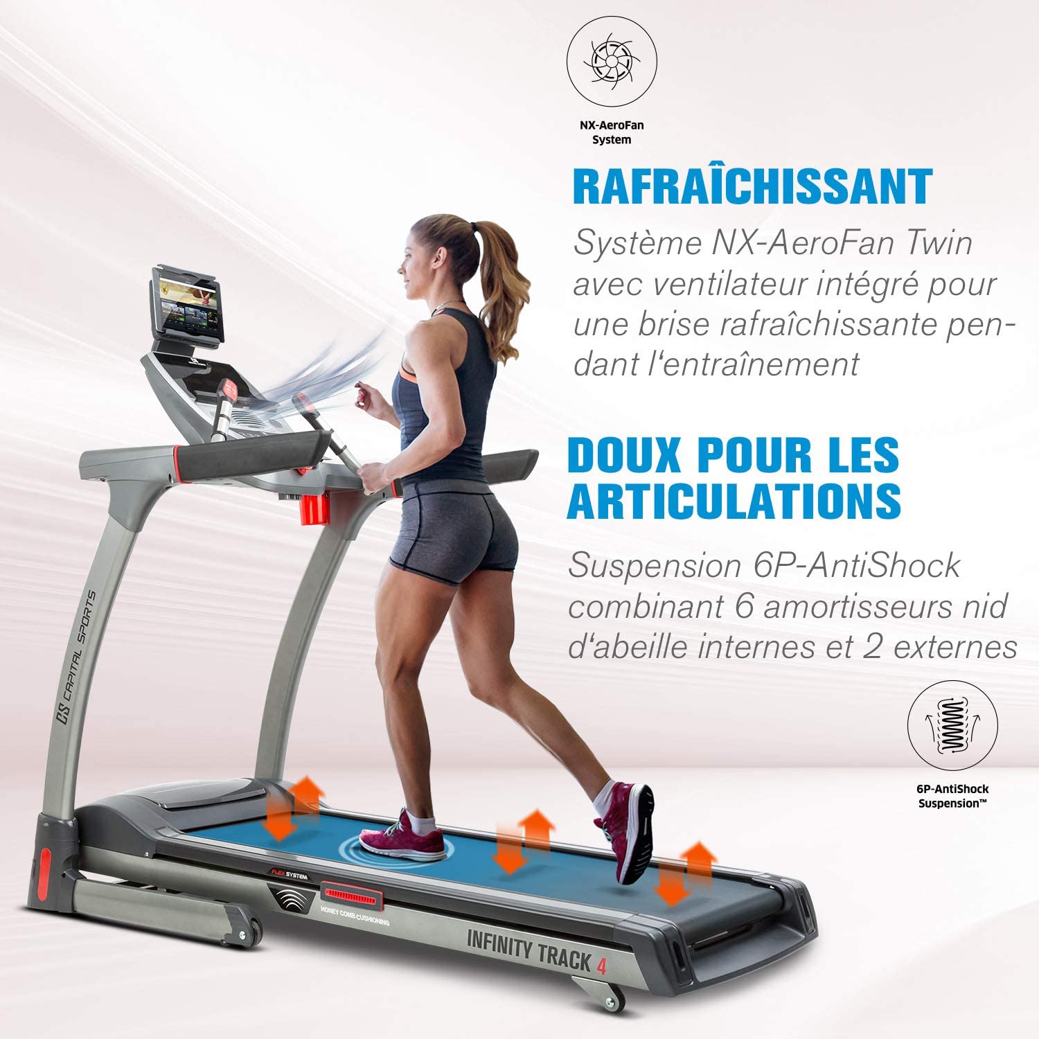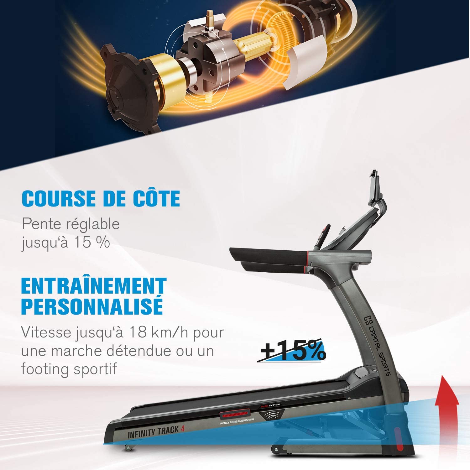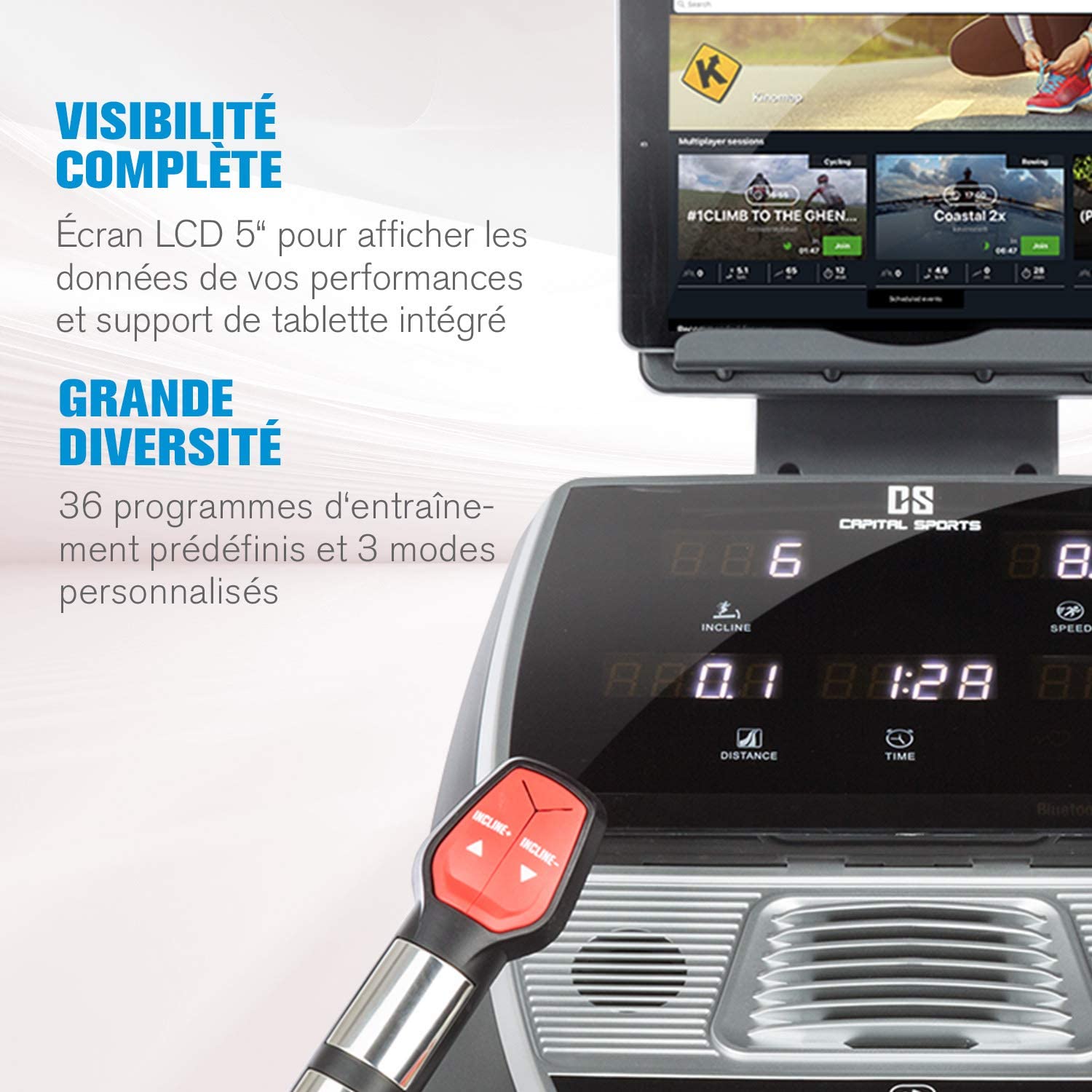 - Courez en toute liberté, avec le tapis de course et de marche Infinity de CAPITAL SPORTS , votre entraînement se transforme en une expérience de haut niveau ! Il vous offre une technologie de pointe pour votre entraînement avec une bande de roulement extra-large.