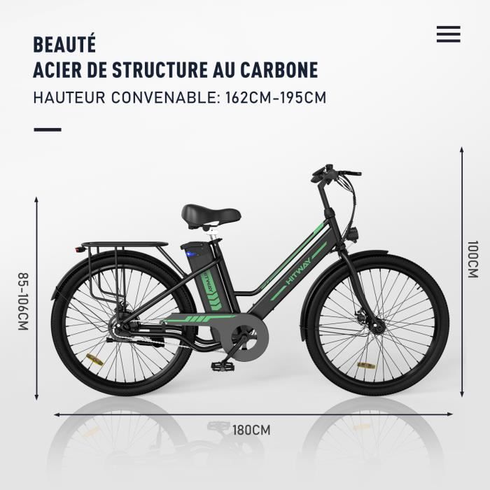 Le panneau de commande LCD est facile à utiliser, et vous pouvez voir clairement le kilométrage, la vitesse et la puissance. Ce vélo HITWAY est conçu avec des selles creuses, et la hauteur est réglable, adaptée aux utilisateurs de 162 à 195 cm de hauteur. Les freins à disque mécaniques avant et arrière fournissent une force de freinage fiable par tous les temps, les feux avant et arrière escortent votre conduite en toute sécurité.