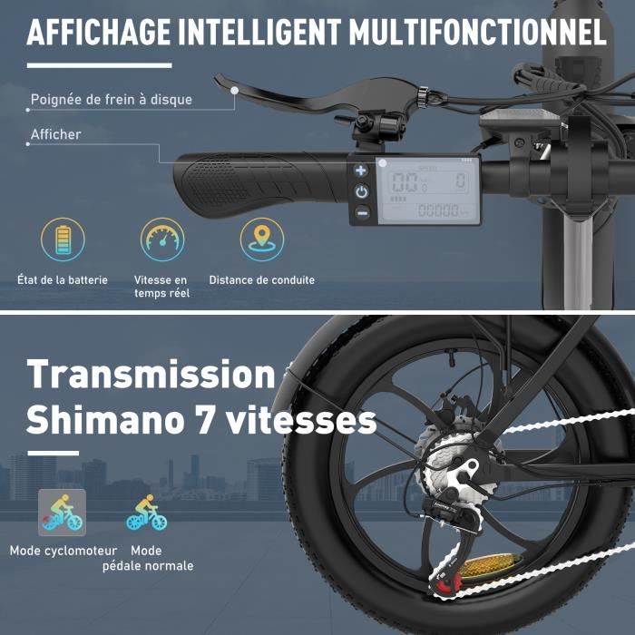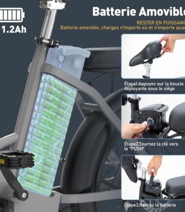 Batterie 36V – 11,2Ah – Moteur 250W – 7 Vitesses – Argent. Feins à disque. Matériau du cadre : aluminium. Nombre de vitesse : 7. Charge de la tablette arrière : 15kg maximum. Charge maximale : 120 kg. Puissance du moteur : 250 W. Temps de charge : 4-5 heures. Le compteur affiche la vitesse du vélo, la barre de batterie, le niveau de vitesse, l’autonomie et les conseils de freinage en temps réel.