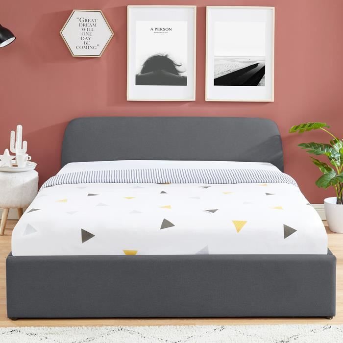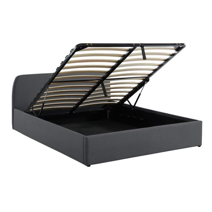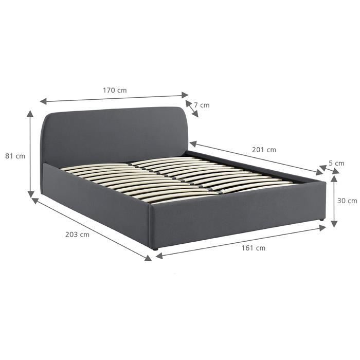| Description du produit | • Style scandinave • Lit coffre 160×200 • Sommier à lattes inclus 26 lattes • Structure en bois contreplaqué • Revêtement en tissu gris foncé • Piètement en bois • Tête de lit arrondie et capitonnée • Dimensions : 170 x 213 x 81 cm • Garantie 2 ans |
