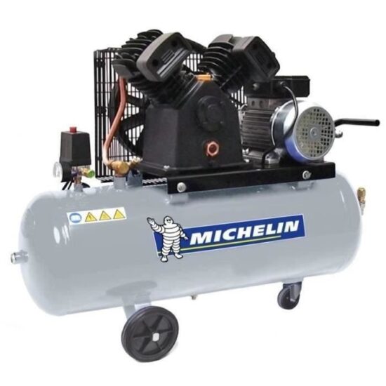 Compresseur Michelin VCX100 100 litres 3cv, 230v – Groupe compression courroie bicylindre en V fonte lubrifié – Débit d’air aspiré de 350 lt/mn pour 240 lt/mn restitué à 7 bars, pression maxi 10 bars – Livré avec roues sans accessoires