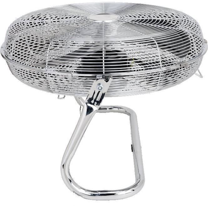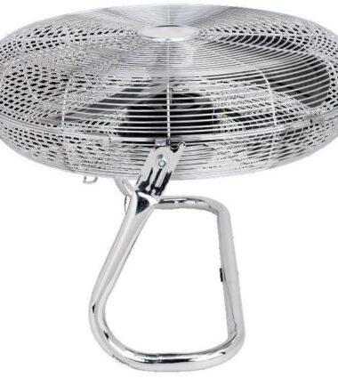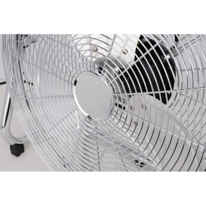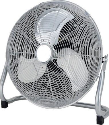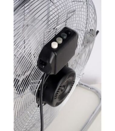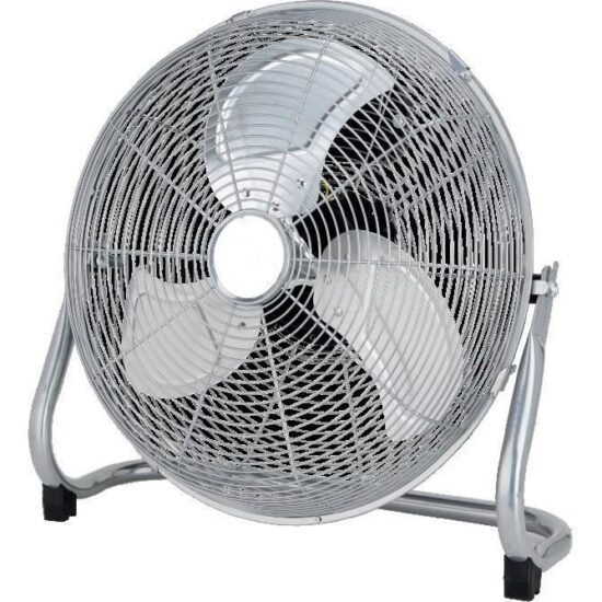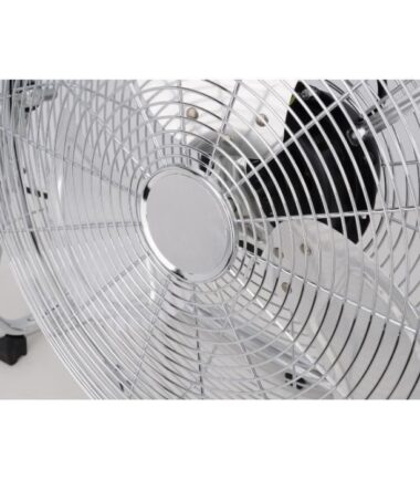 | Description du produit | Ventilateur de sol / industriel – Diamètre 45 cm – Contrôle de l’inclinaison – 3 vitesses – Puissance : 120 Watts – Grille et base en métal chromé – 3 pâles de couleur transparente – Poignée |