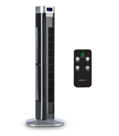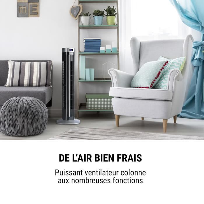 Élégant ventilateur à poser avec trois de vitesses de fonctionnement, trois modes deventilation et fonction oscillation. Minuterie réglable pour une durée de fonctionnement contrôlée et affichage LEDcomprenant la température intérieure.Forme tour peu encombrante avec panneau de commande sur le haut ; télécommandeincluse.L’été vous enlève vos dernières forces et vous laisse vous noyer dans la chaleur ?