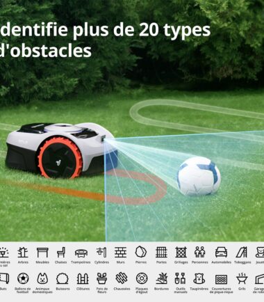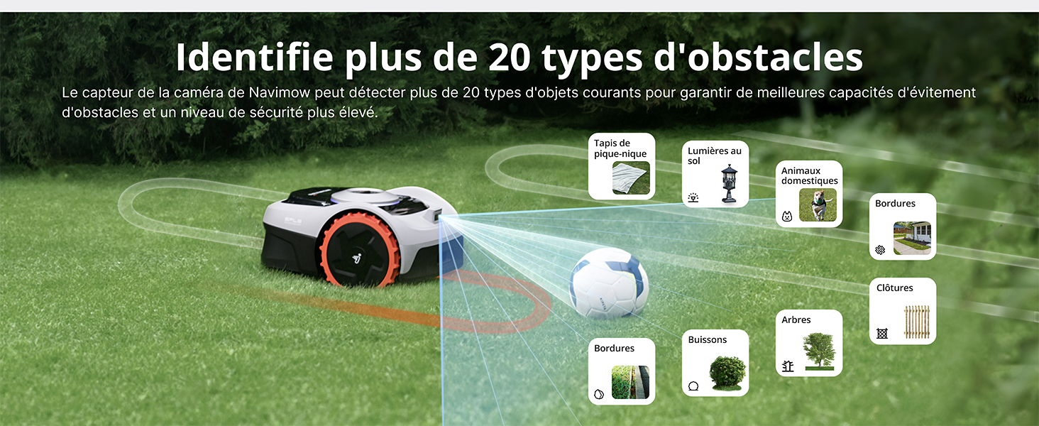 - Identifie plus de 20 types d’obstacles: Par rapport aux capteurs à ultrasons ou aux pare-chocs, la caméra à champ de vision de 140° de Navimow tondeuse a gazon avec des algorithmes Al intégrés peut détecter plus de 20 types d’objets courants dans le jardin pour garantir une plus grande capacité d’évitement des obstacles et un niveau de garantie de sécurité plus élevé.