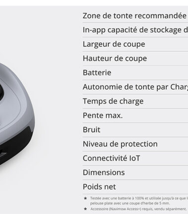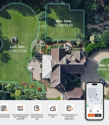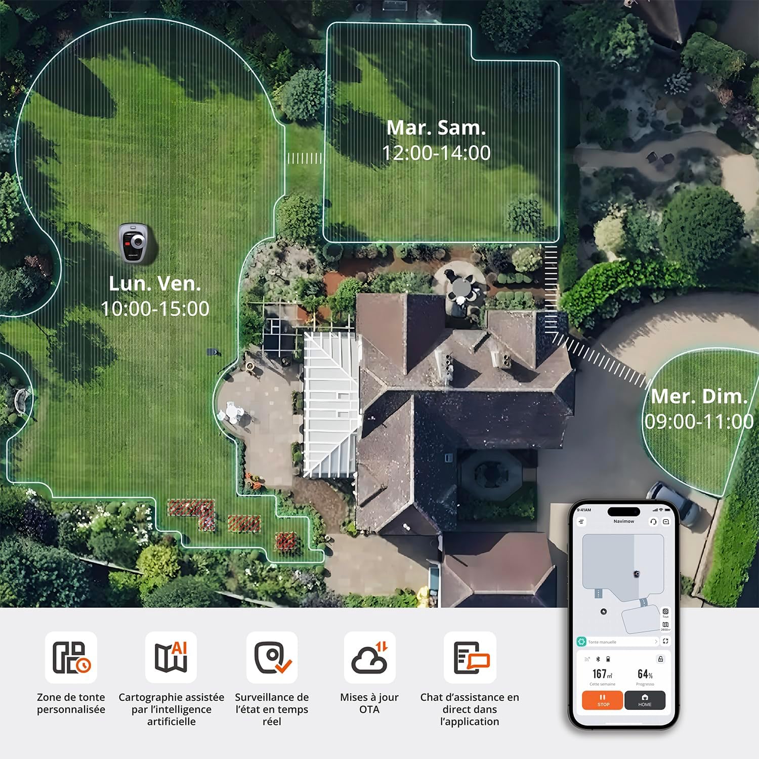- Contrôle intelligent via l’application & gestion multizone: Avec l’application Navimow, vous pouvez modifier la carte de tonte, définir différents horaires et directions de tonte, contrôler à distance votre tondeuse à gazon, suivre la progression de la tonte et localiser votre tondeuses robot en cas de vol (accessoire Navimow Access+ en option requis). Vous pouvez également télécharger facilement des mises à jour en direct (OTA) pour accéder aux dernières fonctionnalités et améliorations.