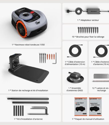 - Contenu de la livraison: 1 * Navimow robot tondeuse sans fil i105E, 1 * Adaptateur secteur, 1 * Câble d’extension d’alimentation (10 m), 1 * Câble d’extension d’antenne (10 m), 10 * Broches pour fixer la rallonge, 1 * Station de recharge et kit d’installation, 1 * Ensemble d’antennes GNSS, 1 * Kit d’installation d’antenne, 12 * Lames et vis de rechange, 1 * Paquet de manuel d’utilisation.
