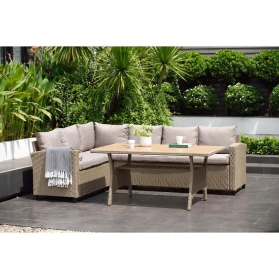 | Description du produit | Canapé d’angle avec table repas, structure en acier recouvert de résine tressée coloris naturel, plateau en Duraboard® (composite) |
