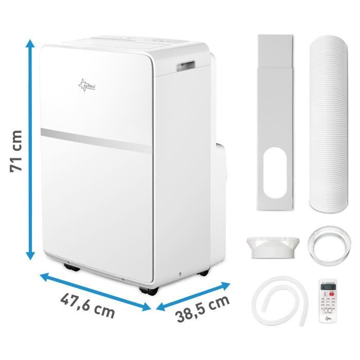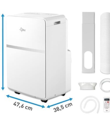refroidissement (2, 4 kW), déshumidification (0,7 L/h) et ventilation (380 m³/h) – idéal pour les pièces de moins de 80 m³ (~34 m²), Réglage de la température (16-31 °C), fonction minuteur, Silent Low Mode (~55 dB), Avec tuyau d’évacuation d’air (~1, 50 m),, adaptateur pour fenêtre, tuyau de drainage, roulettes