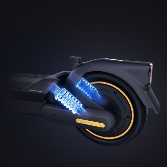 De plus, la trottinette MAX G2 est dotée d’une suspension hydraulique à l’avant et d’une suspension à ressort à l’arrière, offrant une conduite confortable même sur les surfaces les plus accidentées.