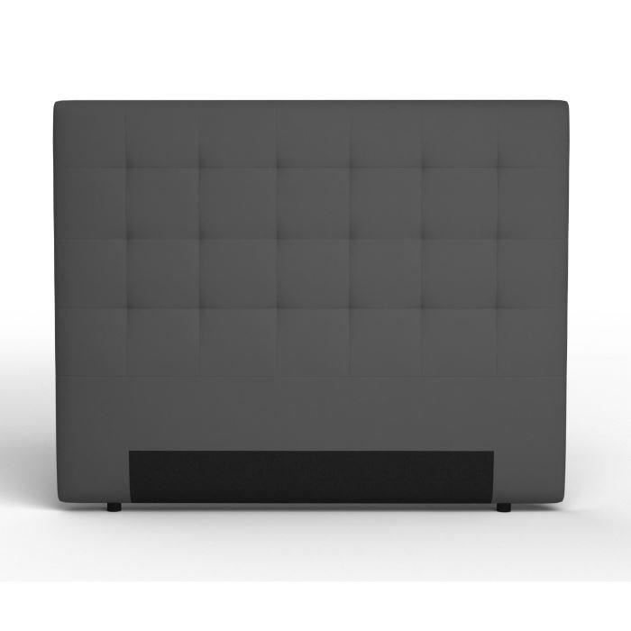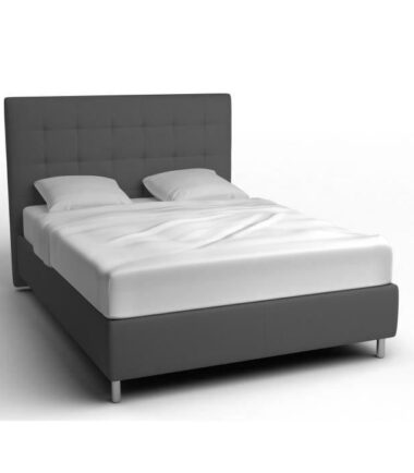 Lit adulte TYYLI l 160 x L 200 cm – En bois et pieds en métal, revêtement en simili gris – Style et design contemporain. Tête de lit capitonnée – 2 hauteurs de sommier – Une barre de renfort centrale permet d’intégrer 2 sommiers de 80x200cm – Sans sommier ni matelas – Dimensions l 173 x L 210 x H 120 cm.