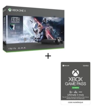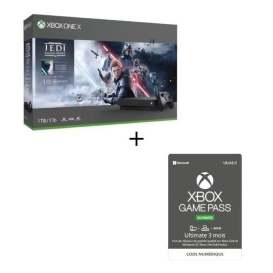 Ce pack comprend : Xbox One X 1 To Star Wars Jedi : Fallen Order + 1 mois d’essai au Xbox Live Gold et au Xbox Game Pass + Abonnement Xbox Game Pass Ultimate 3 mois à télécharger. Code livré par e-mail.